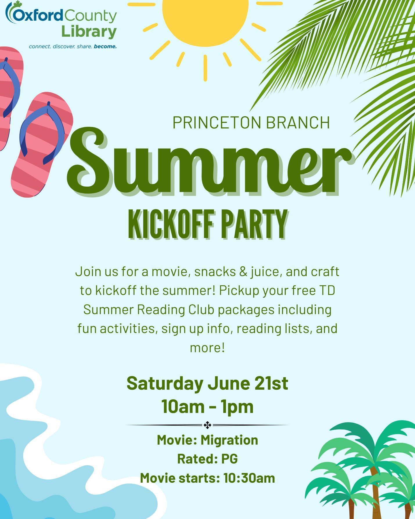 Join the Oxford County Library Saturday, June 21st from 10am-1pm at the Princeton Branch for an epic start to the TD Summer Reading Club!Grab your TD Summer Reading Club kitsMovie starts at 10:30amFun crafts for all agesFollow this link for more information on Summer Reading Club: https://www.ocl.net/programs-events/summer-reading-club/