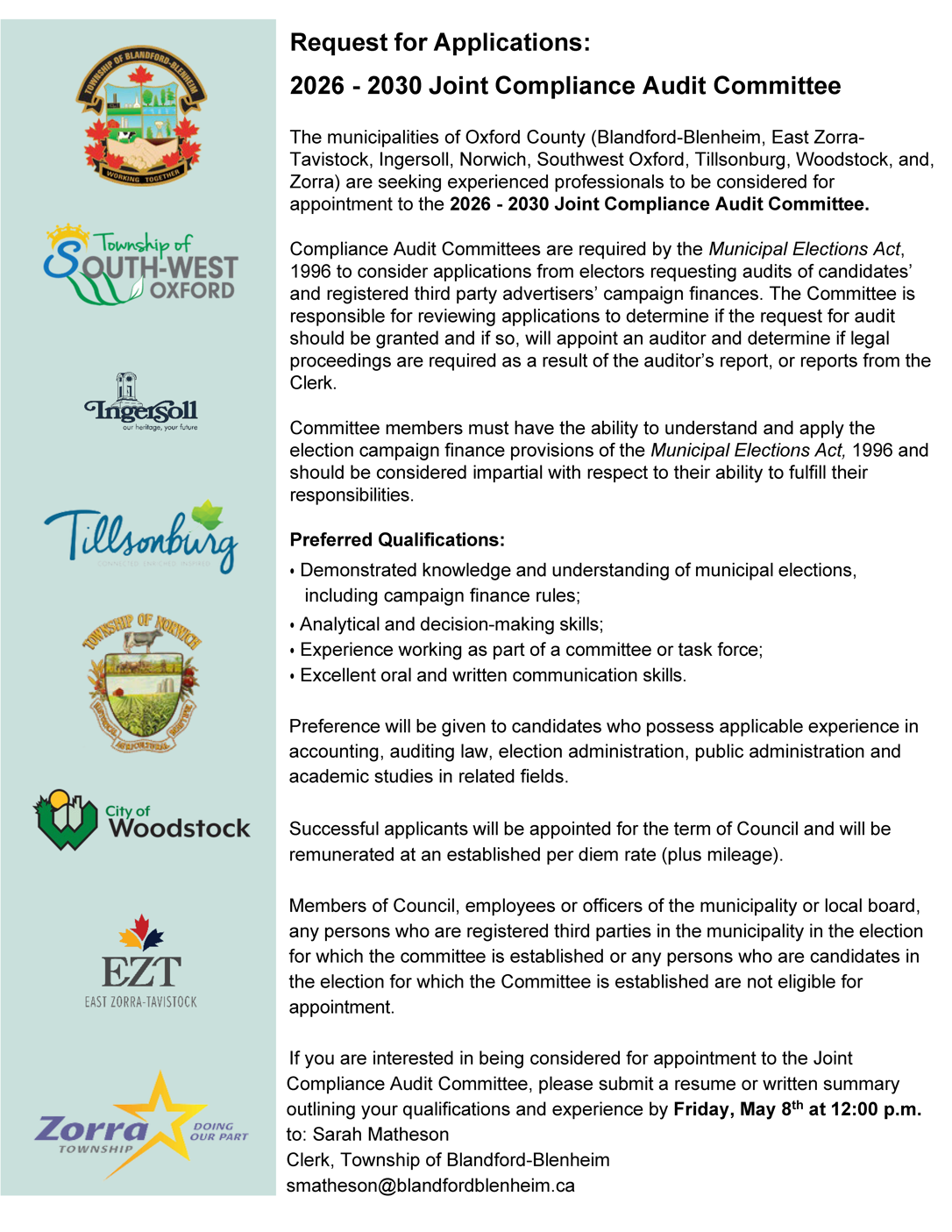 The municipalities of Oxford County, including Blandford-Blenheim, East Zorra-Tavistock, Ingersoll, Norwich, Southwest Oxford, Tillsonburg, Woodstock, and Zorra, are seeking experienced professionals to be considered for appointment to the 2026–2030 Joint Compliance Audit Committee.